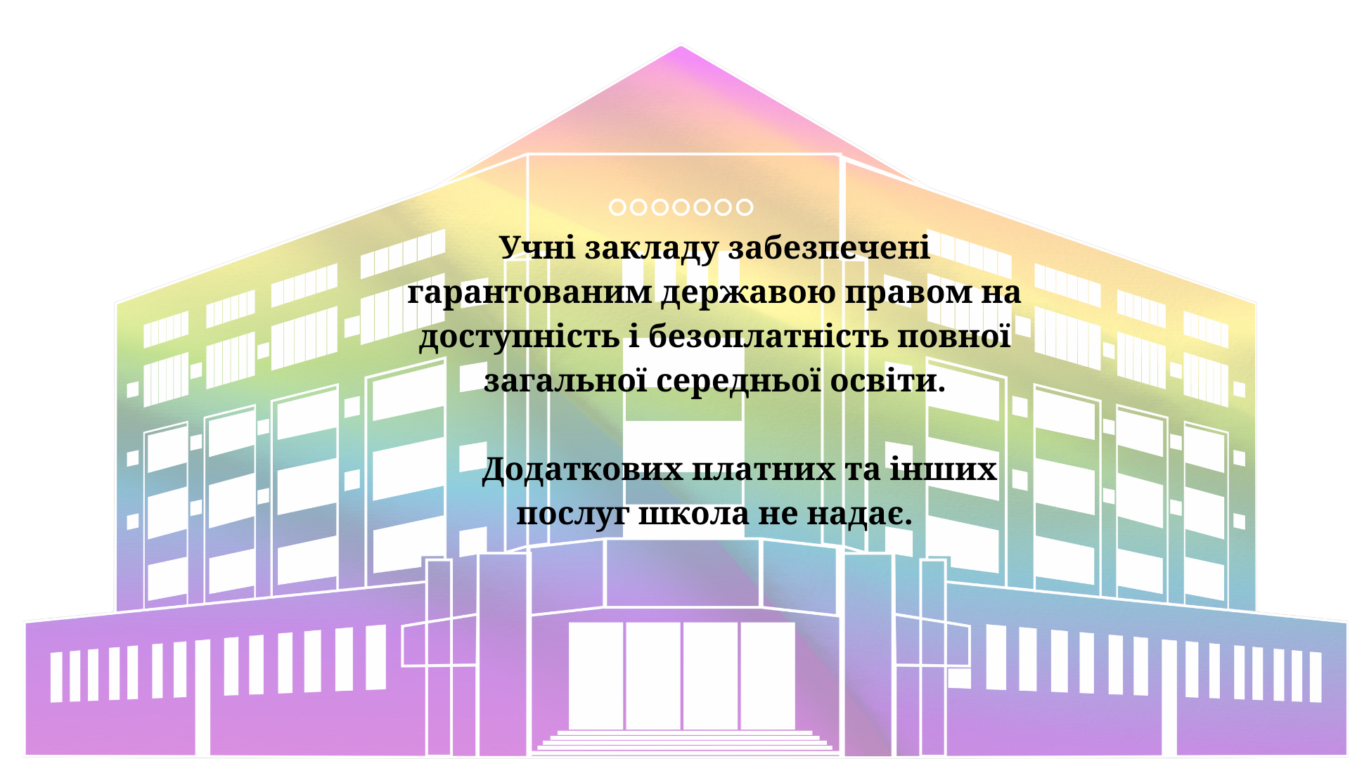 Учні закладу забезпечені гарантованим державою правом на доступність і безоплатність повної загальної середньої освіти. Додаткових платних та інших послуг школа не надає.